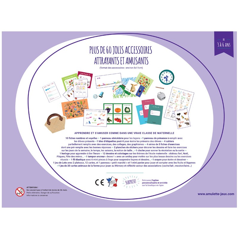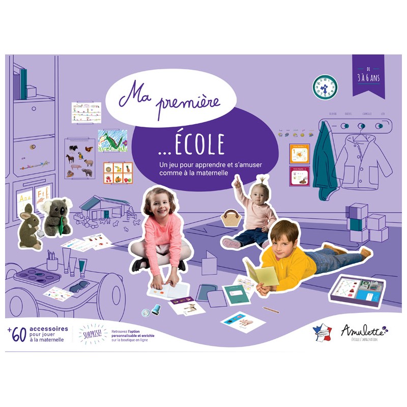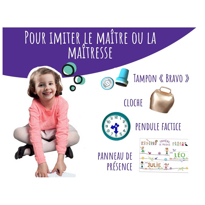 Bienvenue à la maternelle ! Ma première école est un coffret pour jouer à l’école dès 3 ans avec tous les accessoires pour apprendre et s’amuser comme dans une vraie classe de maternelle : Faire l’appel, expliquer les leçons, donner les cahiers et fiches à remplir aux élèves (exercices, graphismes, coloriage, stickers) et les corriger en y mettant le tampon « bravo », organiser des ateliers jeux (jeu de « marchande », de mémory, ...), afficher les leçons et les plus beaux dessins... et sonner la cloche pour la récréation ou la sortie. Un jeu pour jouer à la maîtresse ou au maître ... avant de pouvoir jouer à "Si j’étais la maîtresse". Un jeu éducatif autour des notions importantes à maîtriser en maternelle : lettres, chiffres, repérage dans le temps...Fabriqué en France. A partir de 4 ans.