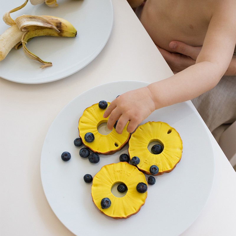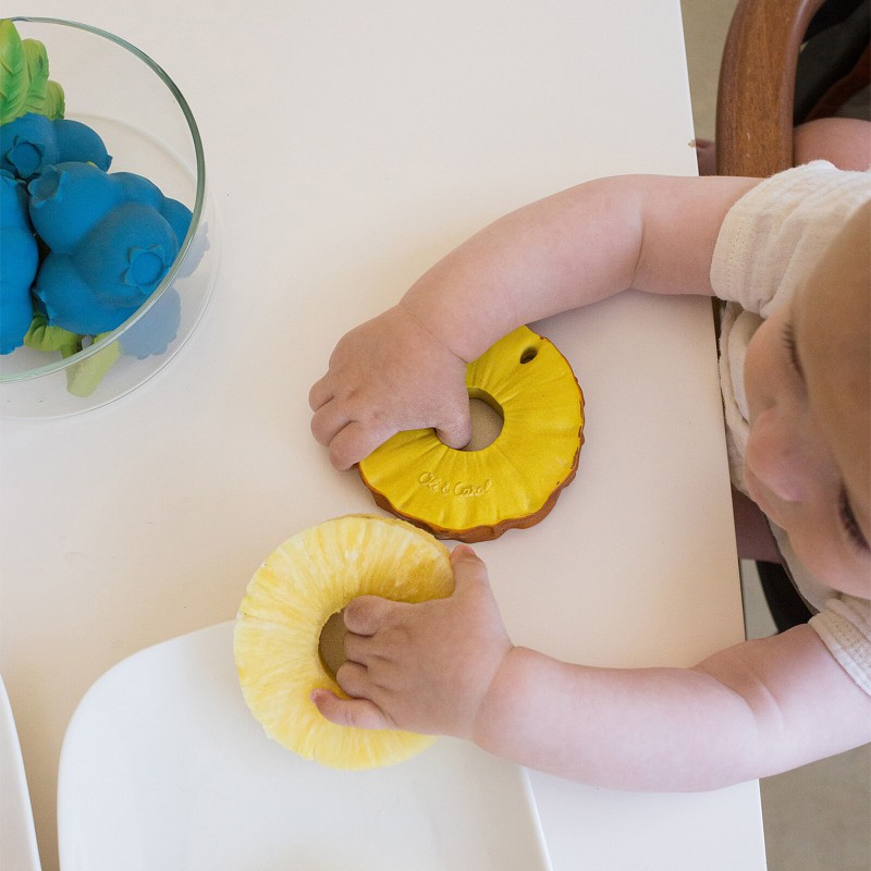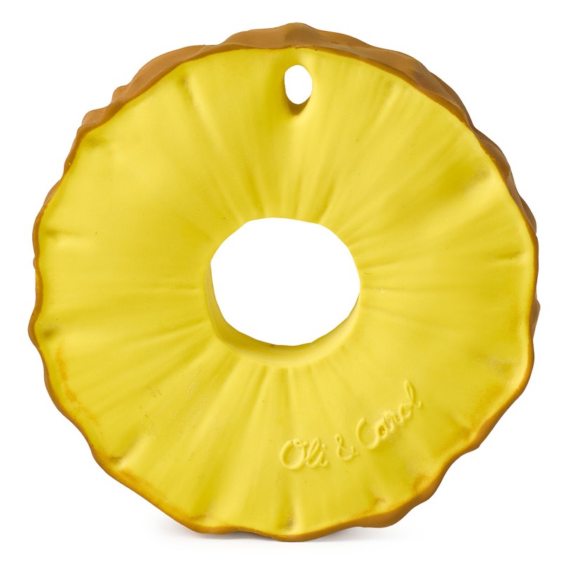 Un anneau de dentition original pour bébé en forme de légume ou de fruit utilisé pour les poussées dentaires ou le bain. Les petites gencives adorent le caoutchouc. Doux, il tient facilement dans la main de bébé. Il atténuera l'inconfort de bébé lors de la poussée dentaire tout en vous initiant aux avantages des habitudes alimentaires. Les jouets Oli & Carol sont fabriqués artisanalement à partir de latex d’hévéa 100 % naturel et ils sont peints à la main avec des colorants naturels. Les jouets Oli & Carol sont sûrs, écologiques et non toxiques (sans PVC, sans BPA, sans phtalates et sans nitrosamines). Anneau de dentition en forme d'ananas de Oli&Carol.