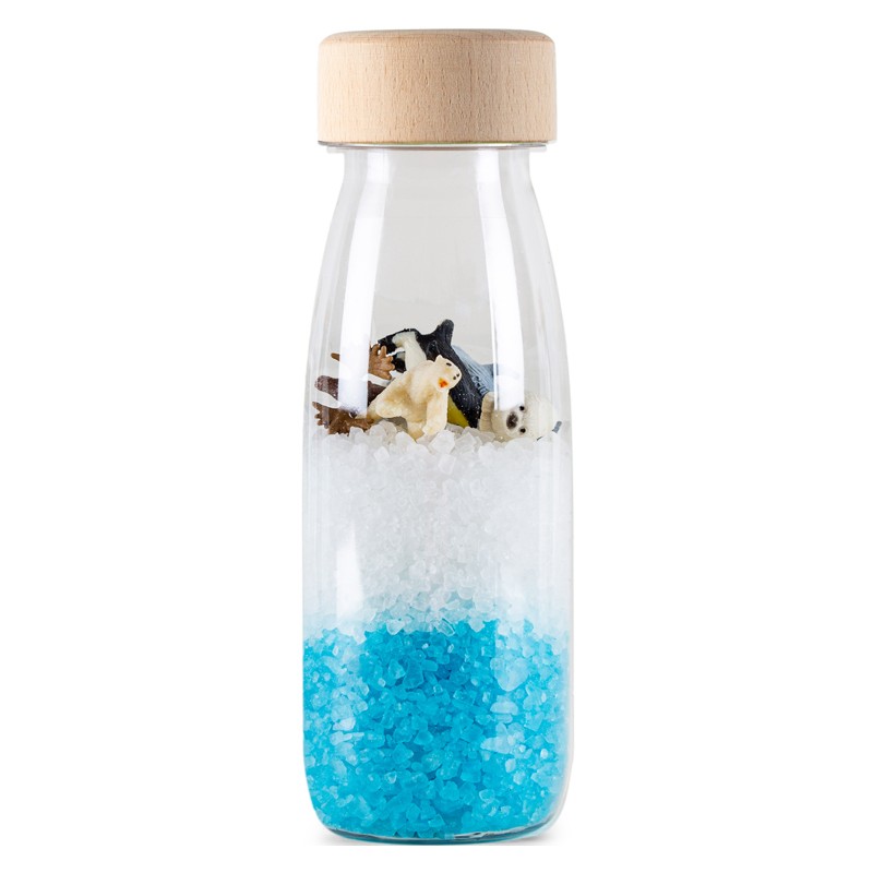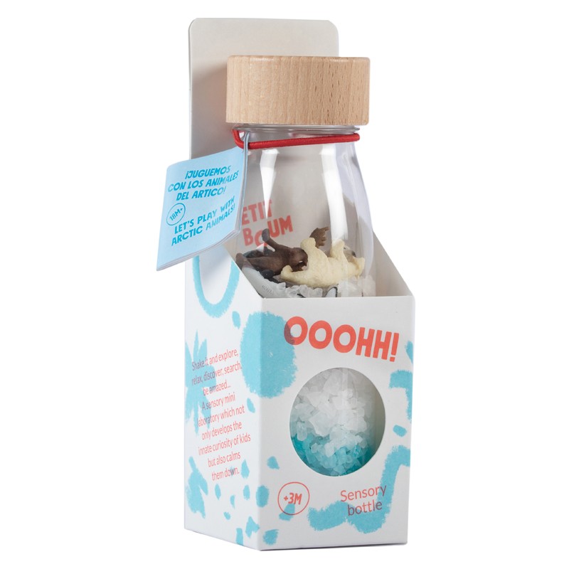 Voici bouteille sensorielle "artic" de Petit Boum ! Une activité d'éveil basé sur le visuel avec cette bouteille d'espionnage sur le thème de la banquise à observer à partir de 3 mois. Une bouteille à secouer qui va stimuler le sens auditif de votre enfant qui va aussi explorer chaque détail et se détendre en observant son contenu. Un mini-laboratoire sensoriel pour les petits curieux. Votre enfant va pouvoir rechercher et découvrir ce qui se trouve à l'intérieur de cette bouteille, identifier les animaux, les secouer pour les cacher, les compter,... Fabriquée à la main et avec amour en Espagne, chaque bouteille sensorielle Petit Boum contient un univers de découvertes, couleurs, lumière et magie pour les enfants. Elles activent l'imagination, la créativité et éveillent la curiosité innée des plus petits. Le système cognitif et sensoriel des enfants possède un énorme potentiel. Les bouteilles Petit Boum les accompagnent dans l'aventure du développement et à chaque étape de leur croissance en stimulant leur sens de la vue, de l'ouïe et du toucher tout en respectant le rythme de chaque enfant. Leur observation favorise la concentration et la relaxation : en contemplant les jeux de lumière et la façon dont les paillettes tombent doucement, les enfants se détendent et se focalisent. Les bouteilles sensorielles Petit Boum respectent les normes européennes les plus strictes et peuvent être manipulées et mâchouillées en toute sécurité. De plus, elles sont incassables et parfaitement scellées grâce à un système de double bouchon. Elles sont fabriquées à partir de plastique recyclable, d'éléments naturels (riz haché et vermicelles colorés, grains de maïs etc.), de petites figurines et d'un bouchon en bois d'érable, le plus résistant et flexible. 90% des fournisseurs sélectionnés par la marque sont locaux afin de réduire l'impact environnemental des bouteilles.