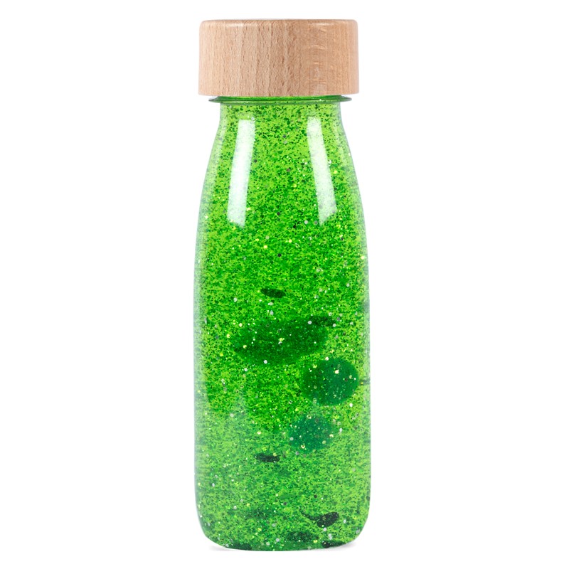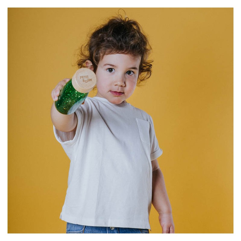 Voici la bouteille sensorielle verte de Petit Boum ! Une activité d'éveil avec une bouteille flottante contenant du liquide à l'intérieur que votre bébé va s'amuser à secouer, à faire rouler, regarder les paillettes et les pompons briller et flotter. Fabriquée à la main et avec amour en Espagne, chaque bouteille sensorielle Petit Boum contient un univers de découvertes, couleurs, lumière et magie pour les enfants à partir de 3 mois. Elles activent l'imagination, la créativité et éveillent la curiosité innée des plus petits. Le système cognitif et sensoriel des enfants possède un énorme potentiel. Les bouteilles Petit Boum les accompagnent dans l'aventure du développement et à chaque étape de leur croissance en stimulant leur sens de la vue, de l'ouïe et du toucher tout en respectant le rythme de chaque enfant. Leur observation favorise la concentration et la relaxation : en contemplant les jeux de lumière et la façon dont les paillettes tombent doucement, les enfants se détendent et se focalisent. Les bouteilles sensorielles Petit Boum respectent les normes européennes les plus strictes et peuvent être manipulées et mâchouillées en toute sécurité. De plus, elles sont incassables et parfaitement scellées grâce à un système de double bouchon. Elles sont fabriquées à partir de plastique recyclable, d'éléments naturels (riz haché et vermicelles colorés, grains de maïs etc.), de petites figurines et d'un bouchon en bois d'érable, le plus résistant et flexible. 90% des fournisseurs sélectionnés par la marque sont locaux afin de réduire l'impact environnemental des bouteilles.