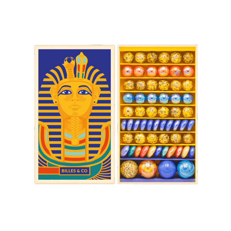 Plongez dans l’univers fascinant de l’Égypte ancienne avec le coffret Toutankhamon, qui renferme un véritable trésor de 62 billes, galets et calots aux couleurs éclatantes du masque du célèbre pharaon de la 18ᵉ dynastie. À la fois ludique et esthétique, ce coffret transforme chaque bille en petit joyau à admirer, à jouer et à collectionner.