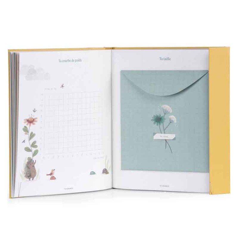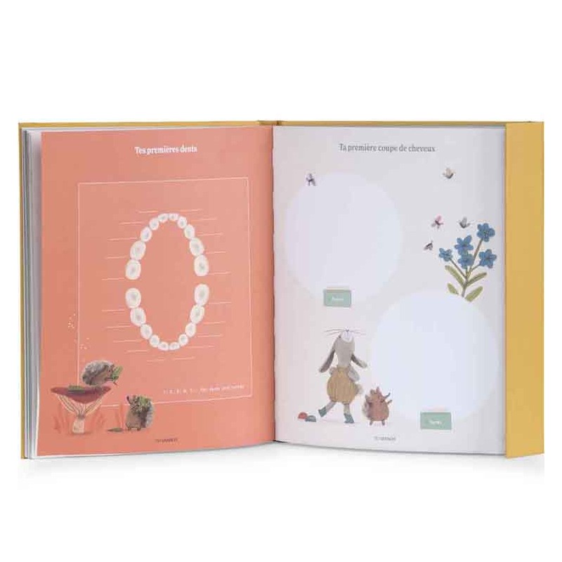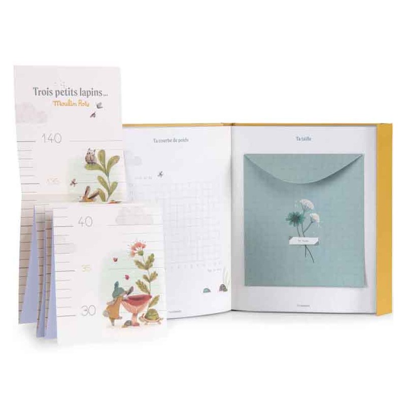 Le livre de naissance de la collection Trois Petits Lapins de Moulin Roty, un livre à trésors de 80 pages richement illustrées, qui accompagne les enfants de leurs premiers jours à leur 6 ans. Un recueil de mots et d'images avec 6 enveloppes à souvenirs et 1 toise en cadeau. Un grand livre avec une fermeture aimantée. De son premier regard... à ses premières découvertes, racontez et conservez les premiers souvenirs de votre enfant dans son livre naissance. Dans un univers tendre et illustré, ce livre à trésors accompagnera votre enfant jusqu'à ses 6 ans. Un recueil de mots et de photos, comme un doux secret à lui transmettre. Un cadeau parfait à offrir pour la naissance d'une fille ou d'un garçon. Un cadeau précieux à conserver pour la vie ! Les textes du livre sont mixtes pour l’enfant et les parents, et conviennent donc à toutes les familles d’aujourd’hui.