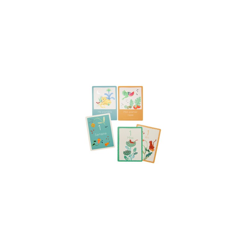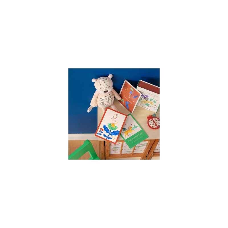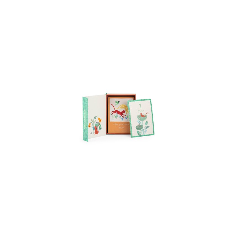 Cartes Mes 12 premiers mois de la collection "La fôret de Mawa" de Moulin Roty. Ce coffret contient 30 cartes pour prendre en photo bébé et retracer les grandes étapes de ses 12 premiers mois. Sur chacune d’elle, un côté thématique illustré avec les tendres personnages de la collection et l’autre pour coller la photo et conserver ces beaux souvenirs. Les premières semaines, les premiers mois, les premières années et ses premières fois : Mon premier bain, Mes premiers pas, Je marche à quatre pattes, Je danse... Un cadeau parfait à offrir en cadeau de naissance pour les filles et les garçons.