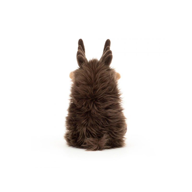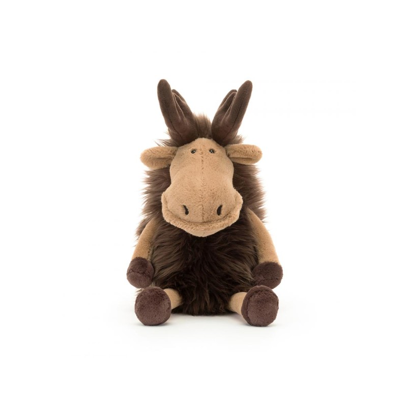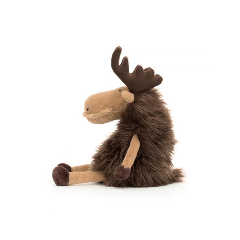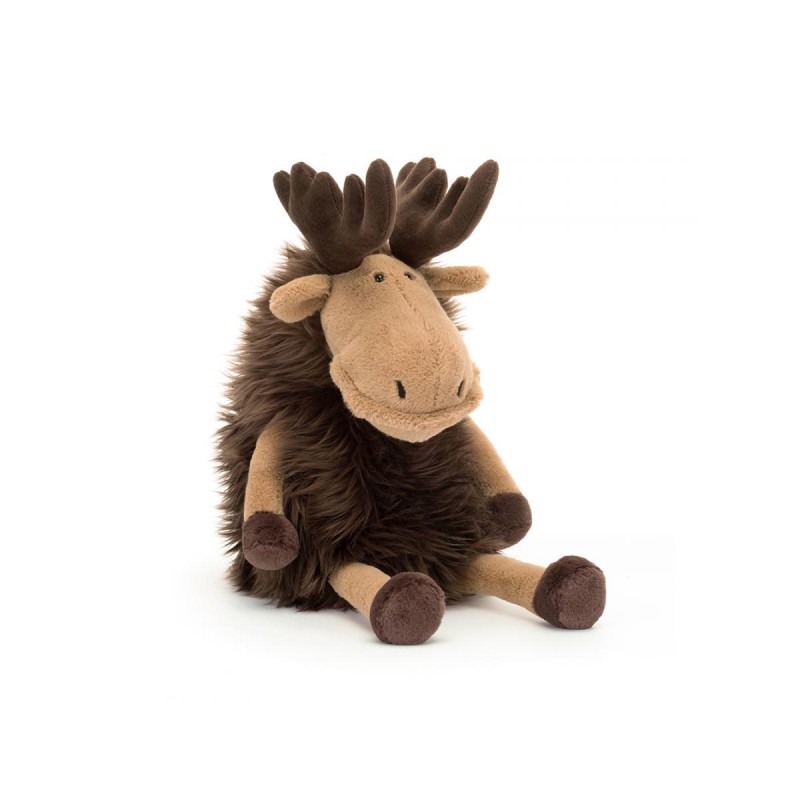 Découvrez la peluche élan Merrick Moose de la célèbre marque londonienne Jellycat : Originale et conçue pour des câlins sans fin, Merrick l'élan ne passe pas inaperçu. Ce superbe compagnon se distingue par sa grande truffe couleur amande, sa lèvre délicatement texturée et son visage aux finitions finement cousues. Véritable géant tout en douceur, il affiche des membres caramel, d’imposantes cornes chocolat, une fourrure moelleuse et ébouriffée, ainsi que d’adorables sabots en peluche.