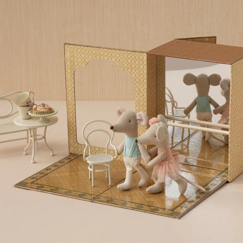 Découvrez le studio de danse des souris de la marque Maileg. Dès que vous ouvrez cette élégante boîte décorée, un monde miniature prend vie : deux petites souris, frère et sœur, vêtues de leurs tenues de danse, vous accueillent dans leur univers fait de grâce et d'imagination.