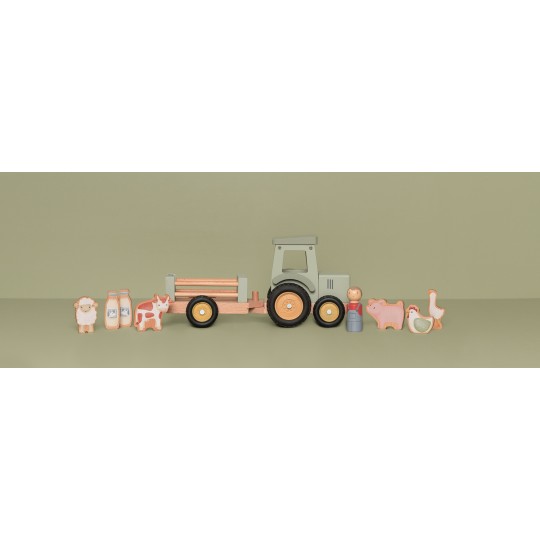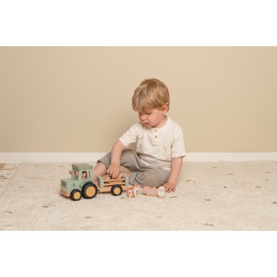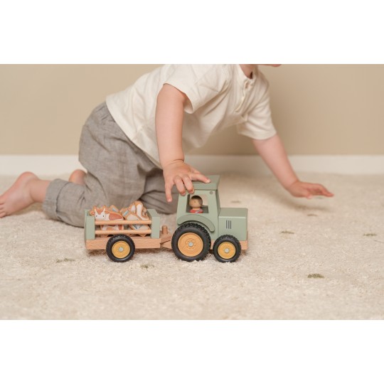 Découvrez le tracteur avec remorque de la collection Little Farm de Little Dutch, un jouet en bois aux couleurs douces conçu pour les enfants à partir de 18 mois. Les animaux sont prêts dans la remorque, le tracteur peut démarrer avec un "Vroom! Vroom!" Le tracteur en bois de haute qualité sera le compagnon idéal de votre enfant dans ses aventures. Il encourage l'imaginaire des enfants pour des histoires passionnantes sur le thème de la ferme. En bonus, la remorque contient deux bouteilles de lait. Un jouet en bois robuste et roulant adapté à tous les enfants !